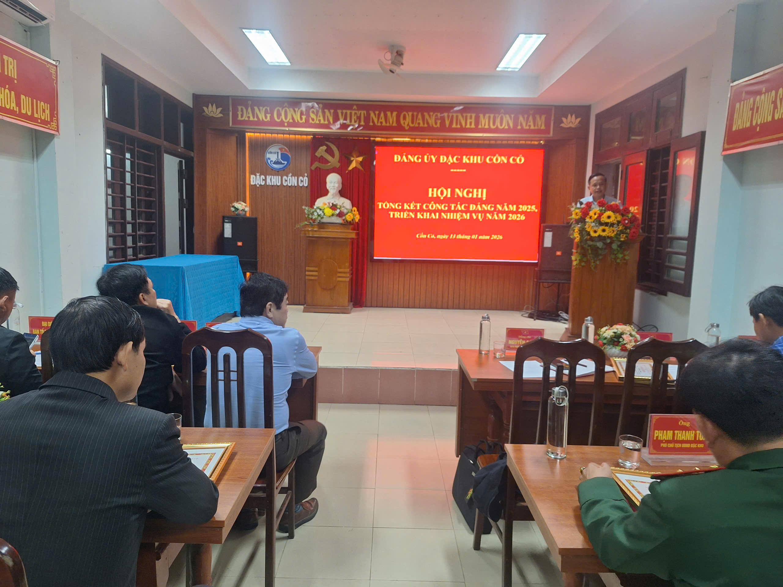Ngày 13/01/2026, Đảng ủy đặc khu Cồn Cỏ tổ chức hội nghị Tổng kết công tác xây dựng Đảng năm 2025, triển khai nhiệm vụ năm 2026. Dự Hội nghị, về phía tỉnh có các đồng chí đại diện Ban Tổ chức, Ủy ban kiểm tra và Văn phòng Tỉnh ủy; về phía đặc khu có các đồng chí uỷ viên BTV Đảng ủy, Ủy viên BCH Đảng bộ, lãnh đạo UBND, Thường trực UBMTTQVN đặc khu, báo cáo viên Đảng ủy; lãnh đạo, chuyên viên Ban Xây dựng Đảng, UBKT, Văn phòng Đảng uỷ cùng đại diện cấp ủy các tổ chức cơ sở đảng, đoàn thể trên địa bàn đặc khu; các tập thể và cá nhân được khen thưởng. Đồng chí Trần Xuân Anh - TUV, Bí thư Đảng ủy - Chủ tịch UBND đặc khu, đồng chí Võ Viết Cường - Phó Bí thư Đảng ủy - Chủ nhiệm UBKT Đảng ủy chủ trì hội nghị.